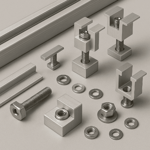 Module clamps secure individual panels to the mounting rails using end clamps at array perimeters and mid-clamps between adjacent panels. Quality clamps ensure proper panel spacing while accommodating thermal expansion.